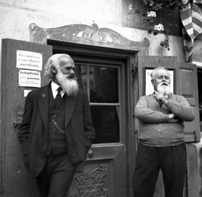 Wahl der Passionsspiele in Oberammergau: Zwei Schauspieler der Theatergruppe für die Passionsspiele (möglicherweise Judas und Paulus), Fotografie: Februar 1934.