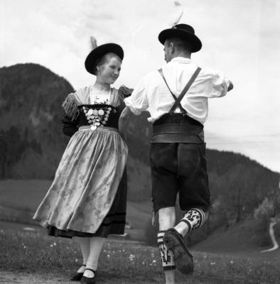 Steyrertanz in Ruhpolding bei Siegsdorf: Ein Paar in bayerischer Tracht tanzt den traditionellen Steyrertanz, Fotografie: August (?) 1938.