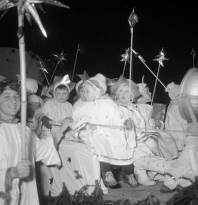 Sternenkinder beim Adventsspiel mit Krippe auf einem Christkindl-Zug in Ohlstadt, Fotografie: Dezember (?) 1959.