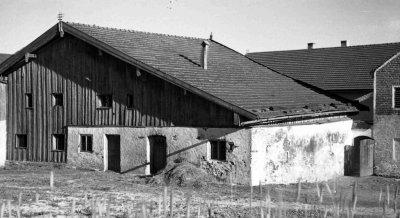 Großflächige Holzverkleidung auf der Rückseite des Stalles der Familie Waidenegger-Brunnen in Malling bei Gangkofen im Landkreis Eggenfelden, Fotografie: 1942 (?).
