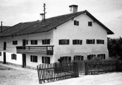 Bäuerliches Wohnhaus (Erntlhof) in Greilsberg bei Bayerbach/Ergoldsbach: Ansicht nach Osten (Giebelseite und Balkonseite), Fotografie: 1952 (?).