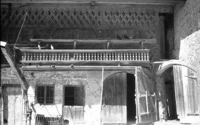 Stadel auf dem Grundstück der Familie Rotbucher in Obergebertsham bei Höslwang: Block-Ständer-Bauweise mit Bundwerk und hölzernem Balusterbalkon, Fotografie: 1952 (?).