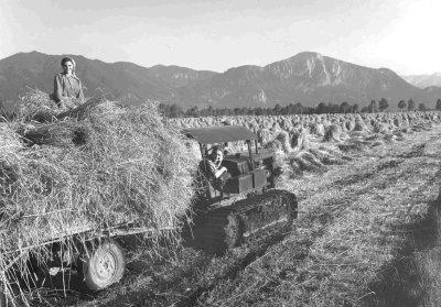 Sommerroggenernte mit einem Raupenschlepper der Moorwirtschafts-Außenstelle Mühleck im Landkreis Weilheim (Oby.). Fotografie: 1.9.1954.