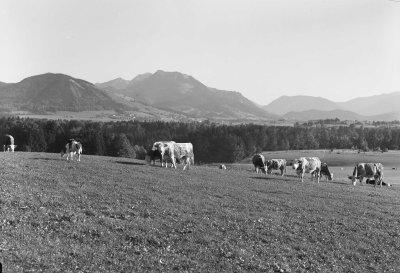 Weide mit Rindern in Sonnreuth bei Woernsmühl (Fischbachau), Lkr. Miesbach, Fotografie: 17.10.1954.