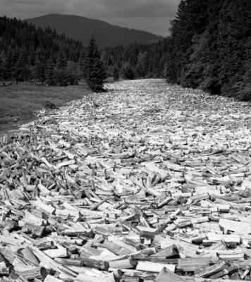 Papierholz-Trift auf dem Regen in der Nähe der Triftsperre Fällenrechen bei Theresienthal (Zwiesel), Fotografie, 13.06.1958.