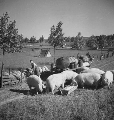 Weide mit einer Schweineherde auf Gut Adldorf (Eichendorf, Lkr. Landau/Isar). Links: Eine Frau bei der Beifütterung von Magermilch, Fotografie: 14.6.1957.
