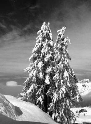 Eingeschneite Lärchenbäume im Fextal bei Sils im Oberengadin/Schweiz. Fotografie: 10.10.1960.