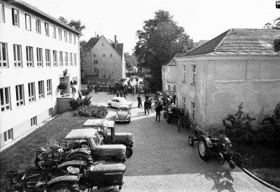 Vorbereitung des achten Landesentscheids im Leistungspflügen: Hof der Landwirtschaftsschule in Straubing, Fotografie: 21.9.1962.