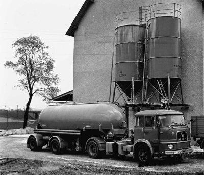 Ein Silotransporter beim Befüllen von Kalkdünger-Hochsilos mit Pressluft, vor der Firma Lorenz Reißl, Inhaber Hein, Neumarkt-St. Veit (Oby.), Fotografie: 29.4.1969