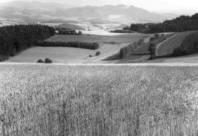 Sommerweizenfeld bei Emmerszell in der Gemeinde Wiesenfelden im Landkreis Bogen/Donau im Kinsachtal. Fotografie: 13.8.1972.