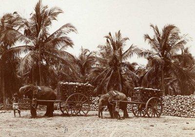 Elefanten transportieren Kokosnüsse in Ceylon, Fotografie: 1908.