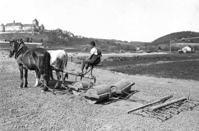 Walzen und Eggen eines Zuckerrübenackers in Wörth an der Donau (Opf.), Fotografie: 18.4.1934.