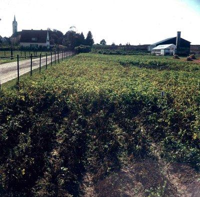 Kali-Versuch mit Kartoffeln auf einem Acker mit Versuchsfeldern der Technischen Hochschule Weihenstephan in Freising-Vötting, Großdia, 11.8.1954.