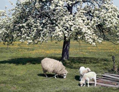 Schafe im Hausobstgarten von Josef Janker in Erpfenzell bei Wiesenfelden (Nby.), Großdia: 17.5.1964.