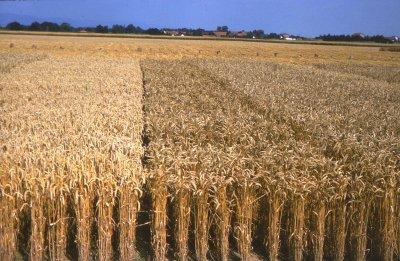 Prüffeld für neuzugelassenen Winterweizen der Sorten 'Nimbus'(links) und 'Disponent' (rechts) der Saatzucht J. Firlbeck aus Rinkam im Landkreis Straubing, Großdia: 5.8.1975.
