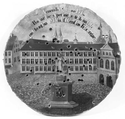 Der Freisinger Marienplatz mit Standbild der Justitia, auf deren Sockel das Stadtwappen erscheint (rechts: Rathaus, dahinter Gymnasium), Schützenscheibe, 1839, Freising, Diözesanmuseum.