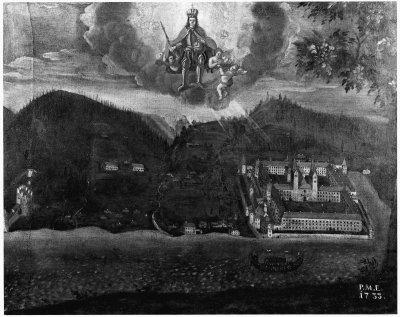 Ansicht des ehem. Benediktinerklosters Tegernsee (oben: hl. Quirinus von Tegernsee als jugendlicher König mit Krone, Szepter und Reichsapfel), Gemälde, 1733, Tegernsee, Museum Tegernseer Tal.