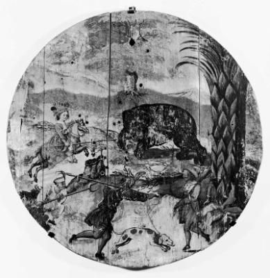 Darstellung einer Bärenjagd (links orientalische Person(?), rechts eine Palme, im Hintergrund eine Burganlage), Schützenscheibe, 2. Hälfte 17. Jh., Tittmoning, Heimathaus des Rupertiwinkels.