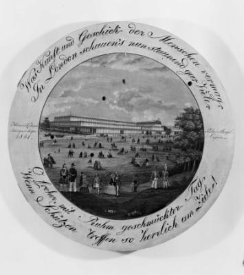 Arnet, G., Ausstellungshalle der 1. Weltausstellung in London (Inschrift: 'Was Kunst und Geschick der Menschen vermag...'), Schützenscheibe, 1851, Uffenheim, Gollachgaumuseum.