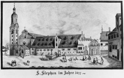 Brunner, L., Ansicht des Augsburger Damenstifts St. Stephan im Jahre 1677 (Damenstift bis 1803, Benediktinerkloster ab 1834), Handzeichnung, um 1950, Augsburg, Benediktinerkloster