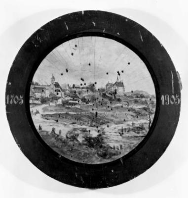 Ansicht der Stadt Bad Tölz (vermutlich im Zustand von 1705, Inschrift mit Datierung: '1705 / 1905', Schützenscheibe, 1905, Bad Tölz, K.P. Feuerschützengesellschaft.