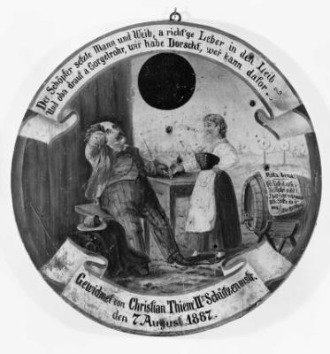 Karikatur eines Paares neben einem Bierfass (Inschrift: 'Der Schöpfer setzte Mann und Weib, a richt'ge Leber in den Leib...'), Widmung und Datierung, 7.8.1887, Creußen, K.P. Schützengesellschaft