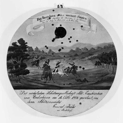 Schlacht bei Peu Ridge (Pea Ridge, USA) am 6.3.1862 mit dem deutschen General Sigel (Inschrift: '...Endschiessen...14.Okt.1863'), Schützenscheibe, 1863, Emskirchen, Schützengesellschaft.