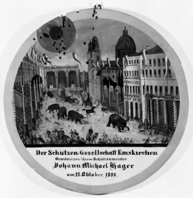 Wander, L.: Entlaufene Elefanten sprengen einen Festzug(?) in der beflaggten Münchner Ludwigsstraße (im Hintergrund die Feldherrenhalle), Schützenscheibe, 11.10.1888, Emskirchen, Schützengesell.