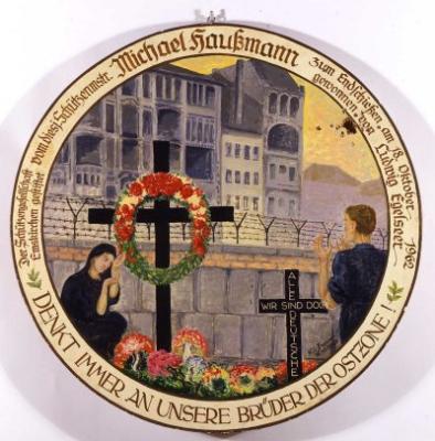 Bauer, Willi: Darstellung der Berliner Mauer, davor eine Frau und ein Mann mit Gedenkkreuzen. Umschrift: 'DENKT IMMER AN UNSERE BRÜDER...', Schützenscheibe, 15.10.1962, Emskirchen, Schützenges.