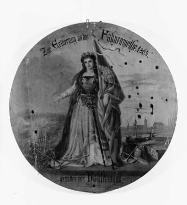 Allegorie der Forchheimia sowie Wappen und Stadtfahne Forchheims (im Hintergrund: Regnitz und Silhouette der Stadt), Schützenscheibe, 1865, Forchheim, K.P. Hauptschützengesellschaft.