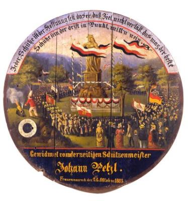 Enthüllung des Niederwald-Denkmals in Rüdesheim mit fahnenschwenkenden und musizierenden Menschen, Schützenscheibe, 24.10.1883, Erlangen, Schützengesellschaft Frauenaurach.