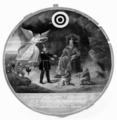 Kaiser Wilhelm I. (1797-1888) empfängt von Kaiser Friedrich I. Barbarossa (1122(?)-1190) im Kyffhäuser die Reichsinsignien, Schützenscheibe, 1.11.1875, Erlangen, Schützengesellsch. Frauenaurach.