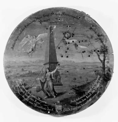 Allegorie zur Geburt Ludwigs II. am 25.8.1845 (Obelisk, Personifikation der Frisingia und Wappen der Stadt Freising), Schützenscheibe, 21.9.1845, Freising, K.P. Feuerschützengesellschaft.