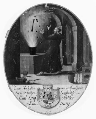 Bildnis des Mönchs und Alchimisten Berthold Schwarz (14. Jh.), dem abendländischen Erfinder des Schwarzpulvers, Schützenscheibe, 19. Jh. (1846?), Fürth, K.P. Schützengesellschaft.