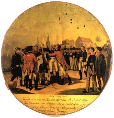 G.L. Blücher und Arthur Wellesley, Herzog von Wellington nach der Schlacht bei Belle-Alliance (Waterloo) am 18.6.1815, Schützenscheibe, 1815, Fürth, K.P. Schützengesellschaft.