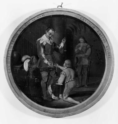 Albrecht von Wallenstein mit seinem Knappen (Anspielung auf Wallensteins Ernennung zum Generalissimus und Feldherrn am 25.7.1625?), Schützenscheibe, 19.3.1864, Lindenberg, Schützengesellschaft.