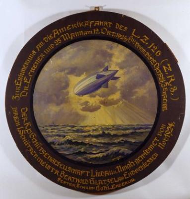 Brodbeck, G.: Ansicht des Zeppelins LZ 126 bei der Amerikafahrt 1924 über dem Atlantik, Schützenscheibe (gestiftet von Berthild Glatzel), 1924, Lindau, Schützengesellschaft.