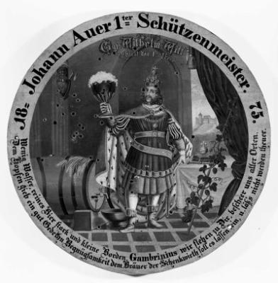 Bildnis des sagenhaften Erfinders des Bierbrauens, Gambrinus (Hz. Johann I. v.Brabant, gest. 1294), mit einem Bierpokal , Schützenscheibe, 1875, Mainbernheim, K.P.Schützengesellschaft.