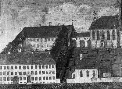 Ansicht des Franziskanerinnenklosters Hl. Kreuz in Mindelheim, Ölgemälde, um 1750, Mindelheim, Franziskanerinnenkloster.
