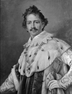 Brustbildnis König Ludwigs I. von Bayern im Krönungsornat mit Hubertusorden, Ölgemälde (vermutl. Kopie nach Joseph Stieler), um 1840, München, St. Bonifaz/Benediktinerkloster.