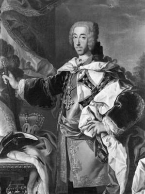 Bildnis des Herzogs Clemens August (Kurfürst v. Köln) als Jagdherr, Ölgemälde, um 1730, München, ehem. Servitinnenkloster, Herzogspitalkirche.