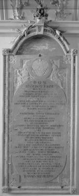 Epitaph des Propstes Franz Töpsl (1711-96), Steinrelief/Rotmarmor, um 1800, Polling, ehem. Augustiner-Chorherrenstiftskirche Hl. Kreuz, nördl. Seitenkapelle.
