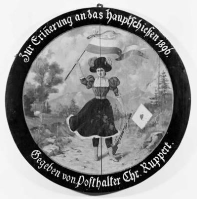 Bildnis einer Frau mit Fahne, Gewehr und Schützenscheibe (im Hintergrund Berglandschaft), Schützenscheibe, 1896, Presseck, K.P. Schützengesellschaft.