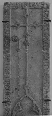 Epitaph mit Kreuz, Mitra und Abtstab, Steinrelief, vor 1400, Reichenbach, ehem. Benediktinerklosterkirche St. Maria.