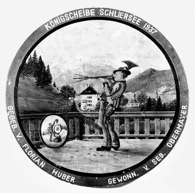 Huber, Florian: Karikatur eines beim Abschuss zitternden Schützen (im Hintergrund der Schliersee), Umschrift: 'Königscheibe Schliersee...', Schützenscheibe, 1937, Schliersee, K.P. Schützengesel.