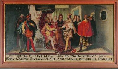 Kaiser Heinrich II. verlobt seine Schwester Gisela um 995 mit König Stephan von Ungarn, Tafelbild (Zyklusbild 2), 1625, Scheyern, Benediktinerabtei, St.Johannes/Kapitelkirche.