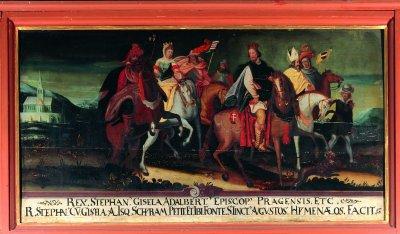 Ritt König Stephans von Ungarn mit seiner Braut Gisela und dem Bischof von Prag um 995 nach Scheyern, Tafelbild (Zyklusbild 3), 1625, Scheyern, Benediktinerabtei, St. Johannes/Kapitelkirche.