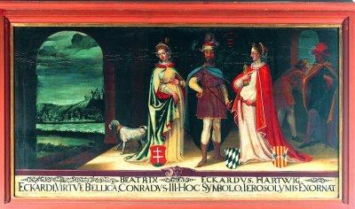 Ekehard von Scheyern mit den Gräfinnen Beatrix und Hartwig um 1148, Tafelbild (Zyklusbild 9), 1625, Scheyern, Benediktinerabtei, St. Johannes/Kapitelkirche.