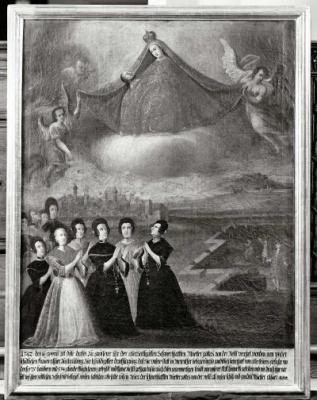 Votivbild mit Darstellung der die Stadt Straubing im österreichischen Erbfolgekrieg beschützenden 'Nesselmadonna', Ölgemälde, 16.04.1742, Straubing, Karmeliten-Klosterkirche Hl. Geist.