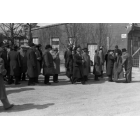Gedenkveranstaltung in ehemaligen Konzentrationslager Dachau: Dr. Philipp Auerbach (2.v.l.) unterhält sich vor Beginn der Veranstaltung mit anderen Gästen auf der Straße, Fotografie: 2. April 1946.